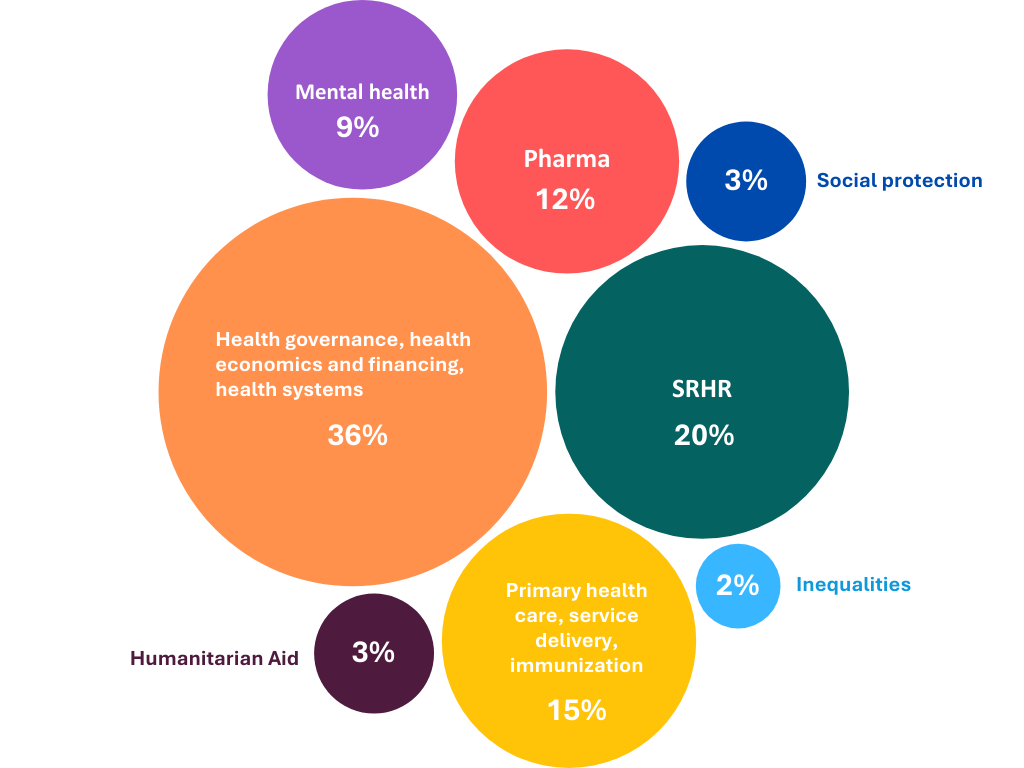 Of our 59 active contracts, 36% focus on health governance, health economics and financing, and health systems; 20% on sexual and reproductive health and rights (SRHR); and 15% on primary health care, service delivery and immunisation. A further 12% of projects address pharmaceutical systems and access to medicines, while 9% concentrate on mental health. Humanitarian aid currently accounts for 3% of our work, with 3% focused on social protection and 2% addressing inequalities.